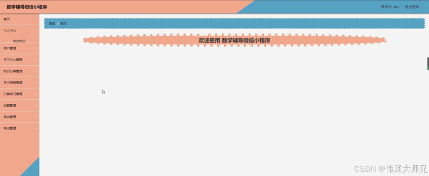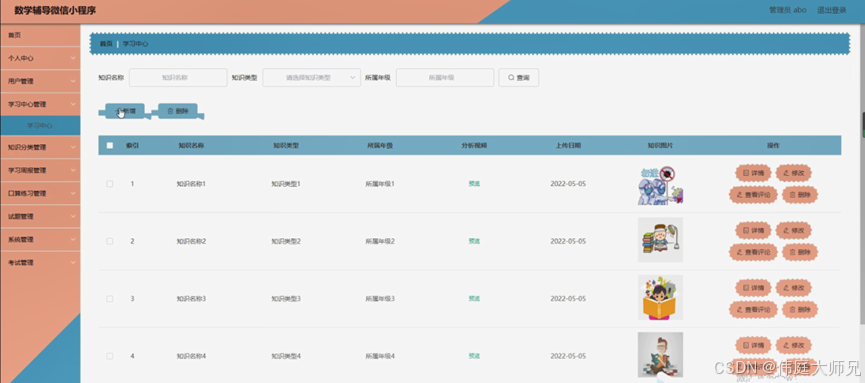 管理员登陆系统后,可以对首页、个人中心、用户管理、学习中心管理、知识分类管理、学习周报管理、口算练习管理、试题管理、系统管理、考试管理等功能进行相应操作,如图5-8所示。