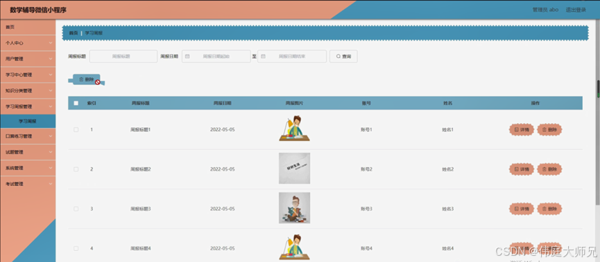学习周报管理,在学习周报管理页面可以对索引、周报标题、周报日期、周报图片、账号、姓名等内容进行详情或删除操作,如图5-12所示。