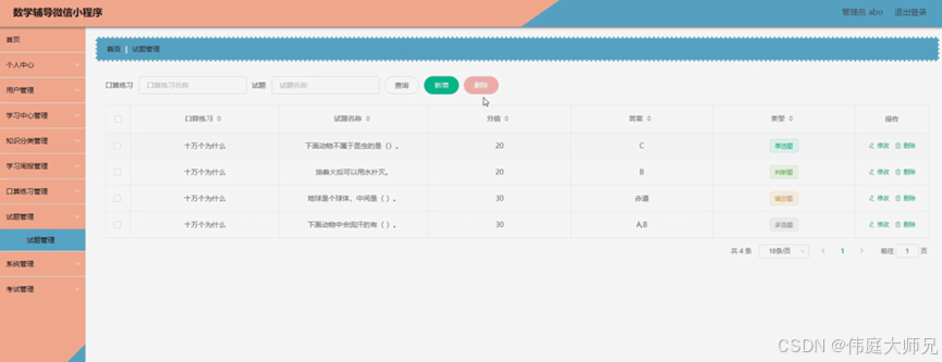 试题管理,在试题管理页面可以对口算练习、试题名称、分值、答案、类型等内容进行修改和删除操作,如图5-14所示。