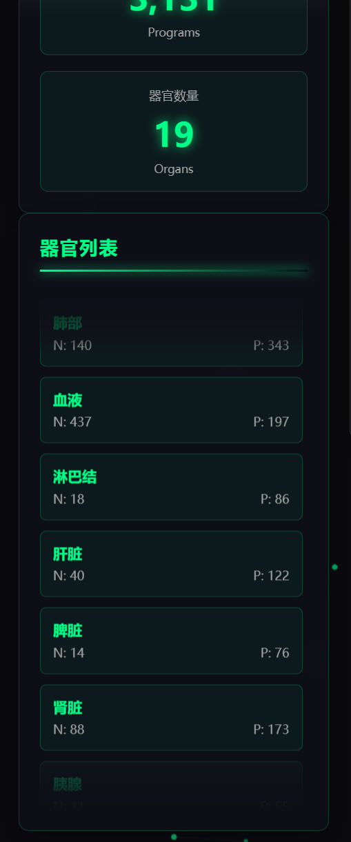 器官数据查询:点击人体轮廓图上的器官标记点,或侧边栏的器官列表项,右侧面板将实时显示该器官的N值(基因共表达网络数)与P值(基因程序数)。