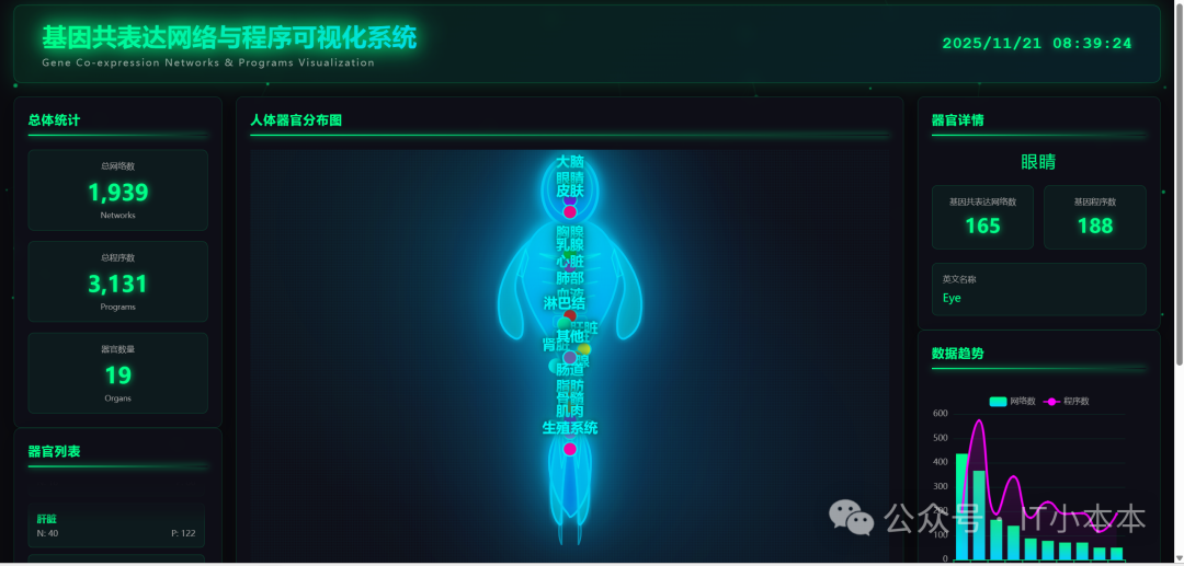 基于技术构建的交互式人体轮廓图是系统的核心创新点之一。图中精准标注了大脑、心脏、肝脏等19个关键器官的位置,点击任意器官标记点或侧边列表项,即可实时显示该器官对应的基因共表达网络数量(N值)与基因程序数量(P值),让原本抽象的"基因-器官关联数据"变得空间化、具象化。