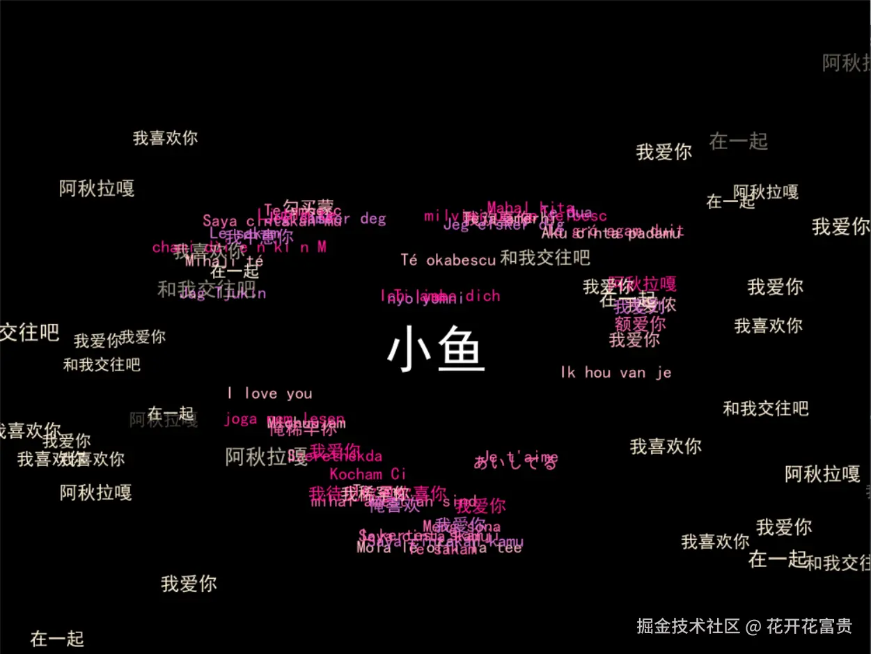 这张图片以黑色为背景,中央突出显示白色的 "小鱼" 字样,周围环绕着多语言的 "我喜欢你""我爱你""和我交往吧""在一起" 等表达爱慕与交往意愿的文字,文字颜色多样,营造出一种充满爱意的视觉氛围。