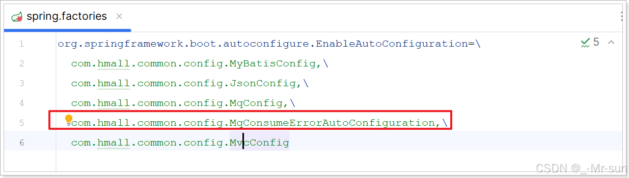 修改 hmall\hm-common\src\main\resources\META-INF\spring.factories 内容添加如下: