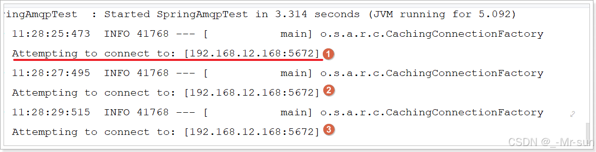 然后执行 com.itheima.publisher.amqp.SpringAmqpTest.testSimpleQueue() 测试发送一条消息,会发现会每隔1秒(连接超时1秒,隔1秒;所以输出的时候显示每隔2秒)重试1次,总共重试了3次。消息发送的超时重试机制配置成功了!