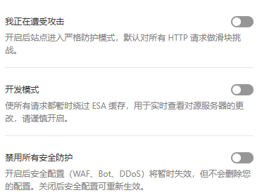 开发模式,开启后,所有请求暂时绕过ESA缓存,便于实时查看源服务器的更改; - 可暂时禁用所有安全防护,开启后安全配置(WAF、Bot、DDoS)将暂时失效,但不会删除配置。关闭后安全配置可重新生效。
