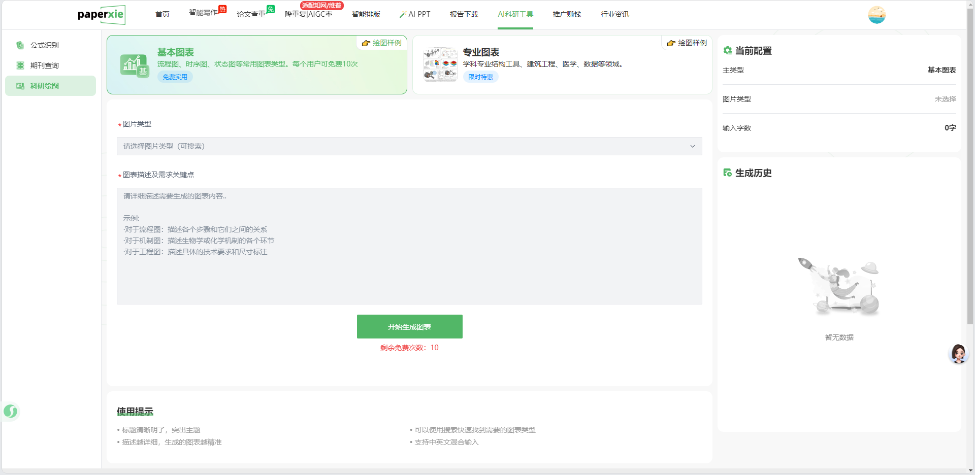 每位注册用户均可获得"10次免费绘图机会",覆盖绝大多数日常科研绘图需求。对于需要大量图表输出的课题组或研究生群体,该额度足以完成开题报告、中期检查、毕业答辩等阶段性任务。