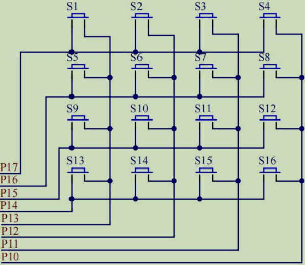 而矩阵按键两端都与单片机 I/O 连接,因此检测时须让按键两端 I/O口都送出低电平
