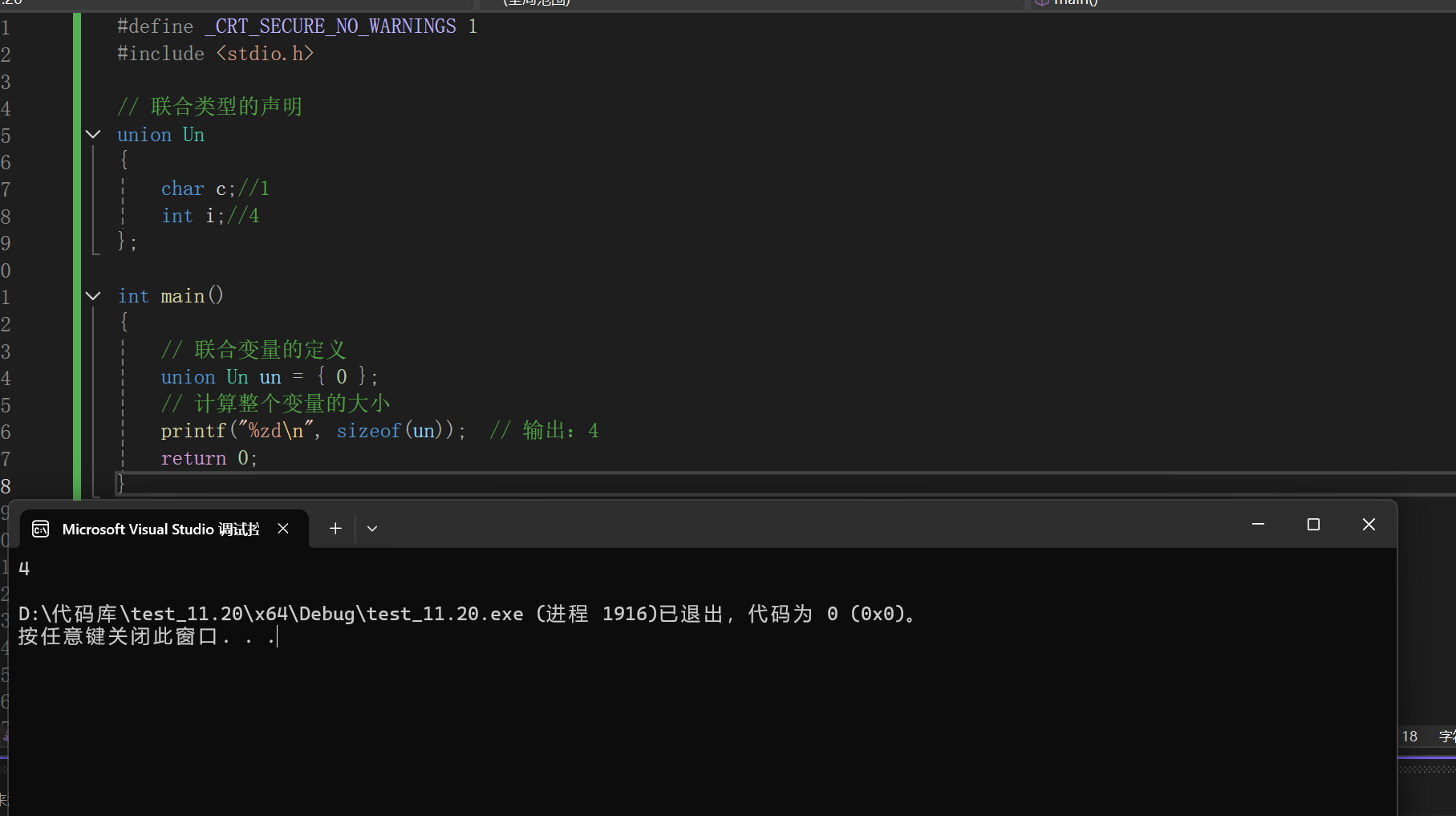 联合的成员是共用同⼀块内存空间的,这样一个联合变量的大小,至少是最大成员的大小(因为联合体至少得有能力保存最大的那个成员)。