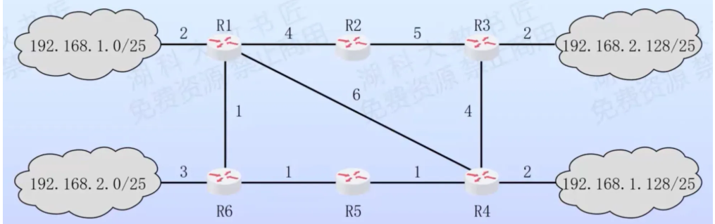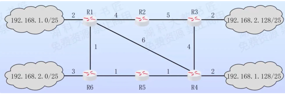 - R1------>R6------>R5------>R4------>R3 因为代价相比于其他路线来说小