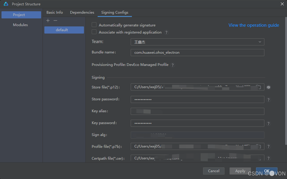 - 切换到 Signing Configs 标签,点击 Auto-generate signature 生成调试签名(首次运行必需)。