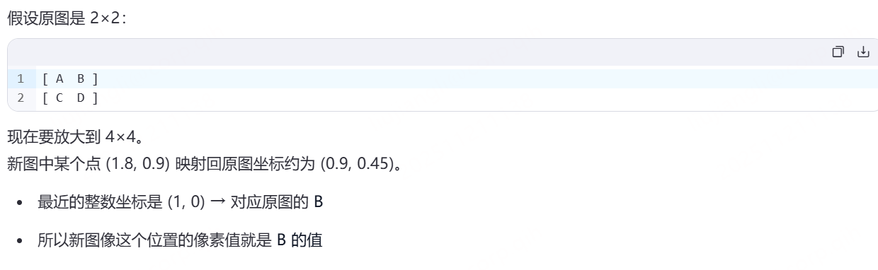 最近邻法实际上是不需要计算新图像矩阵中的点的数值的,直接找到原图像中对应的点,将数值赋值给新图像矩阵中的点,根据对应关系找到原图像中的对应的坐标,这个坐标可能不是整数,这时候找最近的点进行插值