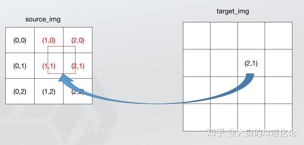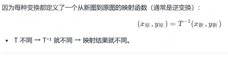 变换方式决定映射关系,映射关系决定原图采样位置 所以既然这样的话哦我就不去举例子计算对应关系了