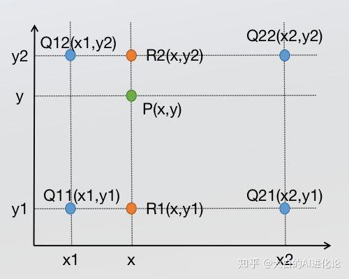 双线性插值就不是找最近的那个点,而是找最近的四个点