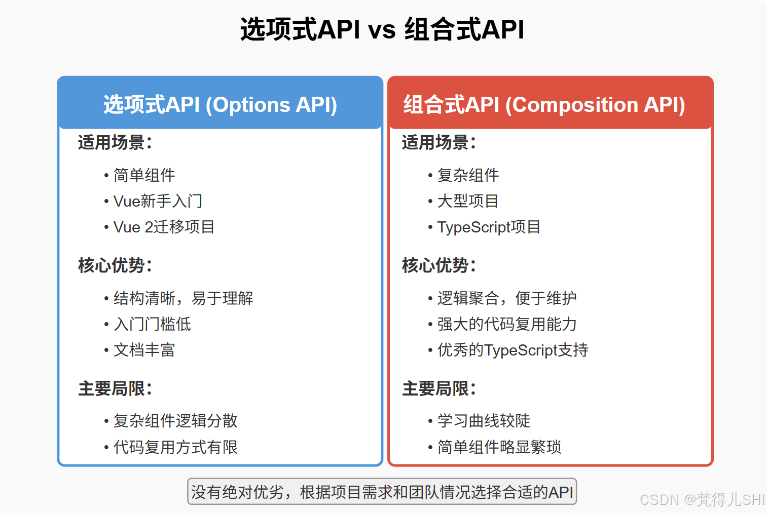 - 选项式 API 适合简单组件,结构清晰;组合式 API 适合复杂组件,逻辑聚合
