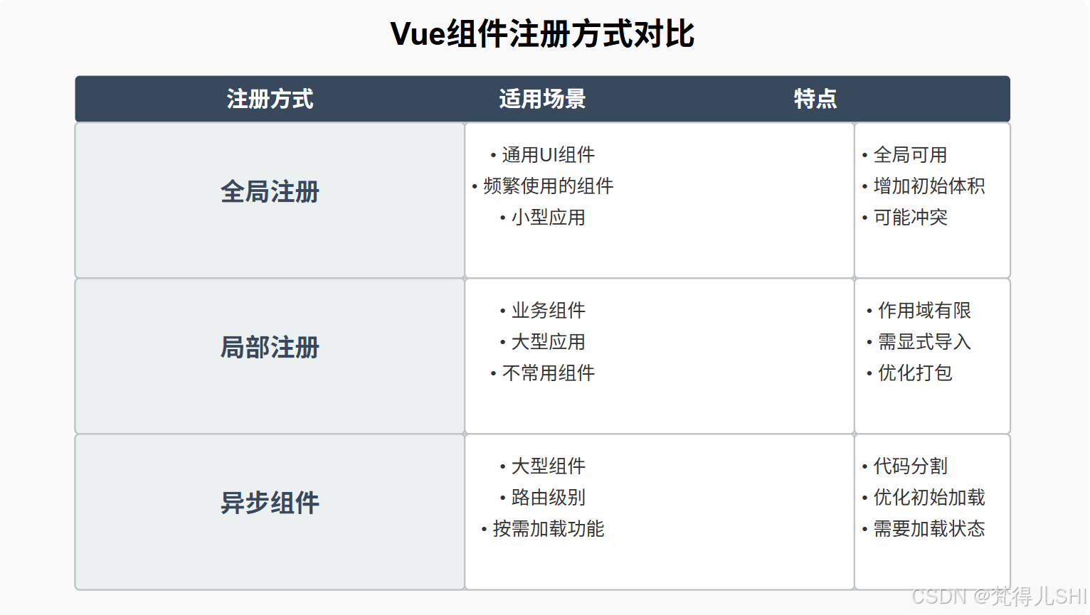- 全局注册适合通用组件,局部注册适合业务组件,异步组件适合优化加载性能