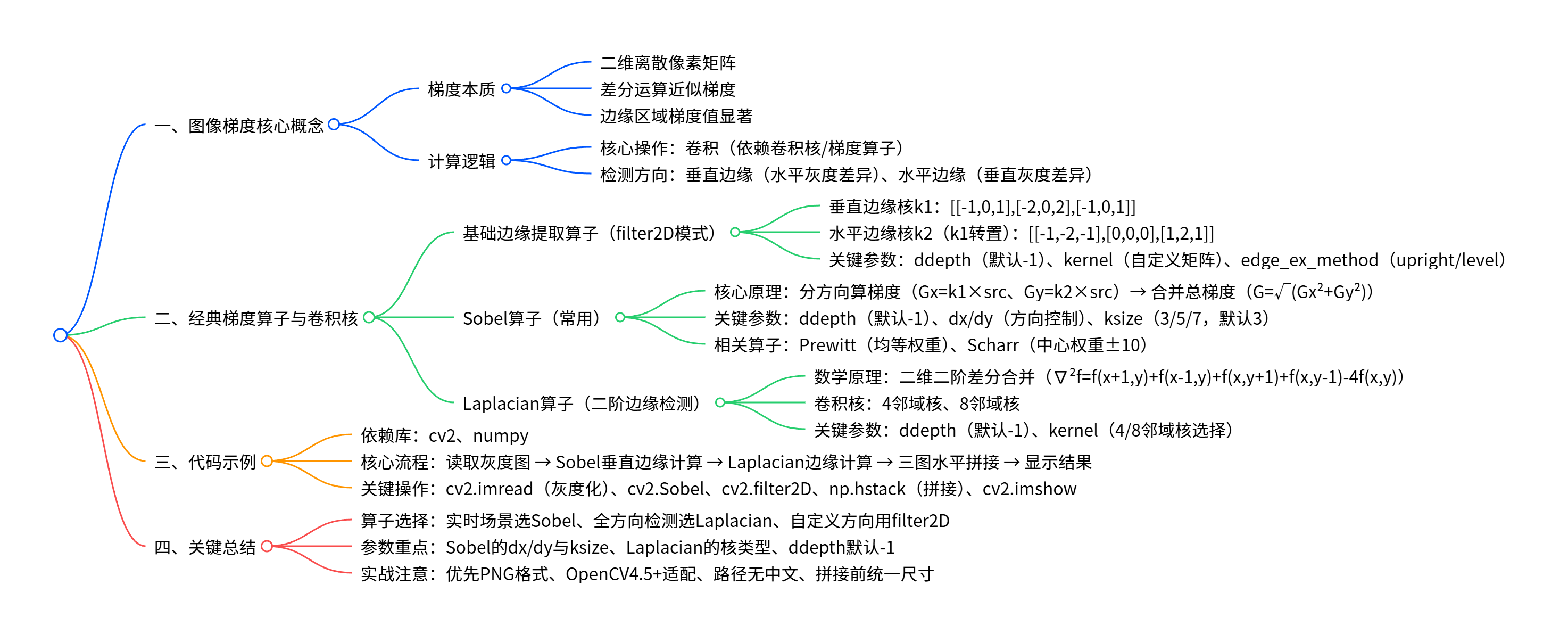 - 基础操作 :通过卷积实现梯度计算,核心是卷积核(梯度算子)------不同卷积核对应不同方向、不同精度的梯度提取。