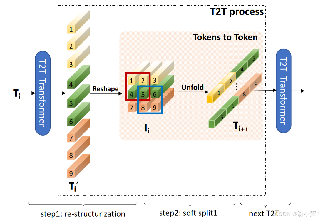 Soft Split):使用重叠滑动窗口(如7×7大小,stride=4) 将 I i I_i Ii 拆分为新token序列 T i + 1 T_{i+1} Ti+1,通过拼接邻域token聚合局部信息: