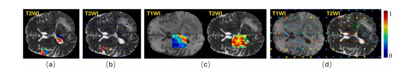 图6 k空间数据及预测低频掩码的可视化结果: (a)高质量T1加权磁共振图像(T1WI)、(b)欠采样T2加权磁共振图像(T2WI)、(c)低场T1加权磁共振图像(T1WI)、(d)低场欠采样T2加权磁共振图像(T2WI)。