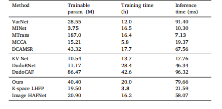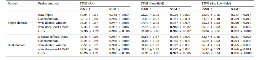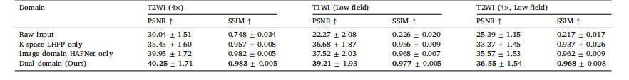 Table 2For the BraTs dataset, ablation of the k-space LHFP network and image domain HAFNet