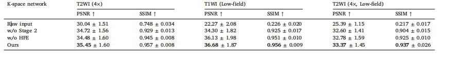 Table 3For the BraTs dataset, ablation of the key components in the k-space progressive learning network.
