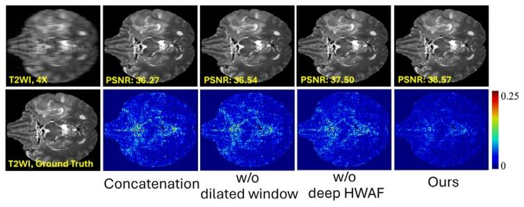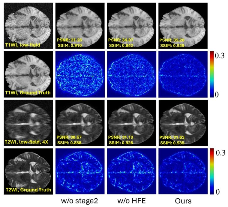 Fig. 5. For an example of the joint reconstruction of the low-field T1WI MRIand 4× accelerated low-field T2WI MRI in the BraTs dataset, visualization ofthe reconstructed images and error maps obtained from different versions ofthe k-space network.