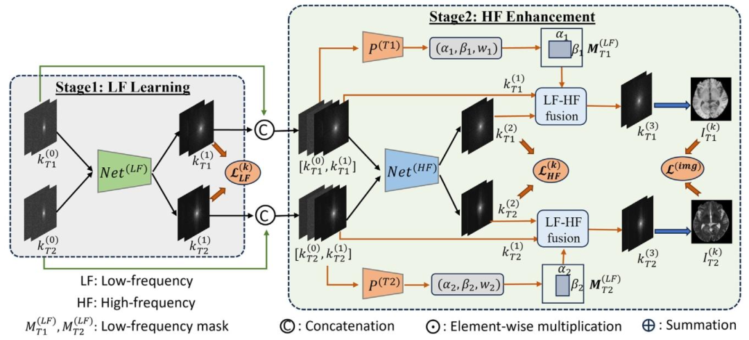 在磁共振成像(MRI)系统中,高质量的T1加权(T1WI)和T2加权(T2WI)图像,以及全采样k空间信号,可表示为I{T1}, I{T2} \\in \\mathbb{R}\^{h \\times w}和k{T1}, k{T2} \\in \\mathbb{R}\^{h \\times w \\times 2},其中h和w分别表示图像的像素高度和宽度,k空间数据包含实部和虚部两个通道。受系统噪声和欠采样影响,k空间数据会受到污染,记为k{T1}\^{(0)} = k{T1} + \\epsilon、k{T2}\^{(0)} = \\mathbf{M} \\odot (k{T2} + \\epsilon),其中\\epsilon代表低场噪声,\\mathbf{M}为欠采样掩码。T1WI数据仅受低场噪声影响,而T2WI信号为实现加速,既含噪声又经过欠采样。本研究通过依次进行k空间和图像域学习,从受污染的k空间信号k{T1}\^{(0)}和k{T2}\^{(0)}中联合重建高质量图像I{T1}'和I{T2}'。 如图1所示,受污染的k空间数据k{T1}\^{(0)}和k{T2}\^{(0)}经"低频到高频渐进式(LHFP)"学习网络优化,生成更高质量的k{T1}'和k{T2}'。该LHFP网络包含低频学习阶段和高频增强阶段。为进一步优化图像细节并挖掘多模态互补特征,经优化的k空间数据k{T1}'和k{T2}'被重建为图像I_T(k_1)和I_T(k_2),随后由图像空间"混合注意力融合网络(HAFNet)"联合去噪。k空间LHFP网络和图像空间HAFNet均由高质量MRI图像(I{T1}, I{T2})和k空间信号(k{T1}, k{T2})进行监督。 在磁共振成像(MRI)系统中,高质量的T1加权(T1WI)和T2加权(T2WI)图像,以及全采样k空间信号,可表示为I{T1}, I{T2} \\in \\mathbb{R}\^{h \\times w}和k{T1}, k{T2} \\in \\mathbb{R}\^{h \\times w \\times 2},其中h和w分别表示图像的像素高度和宽度,k空间数据包含实部和虚部两个通道。受系统噪声和欠采样影响,k空间数据会受到污染,记为k{T1}\^{(0)} = k{T1} + \\epsilon、k{T2}\^{(0)} = \\mathbf{M} \\odot (k{T2} + \\epsilon),其中\\epsilon代表低场噪声,\\mathbf{M}为欠采样掩码。T1WI数据仅受低场噪声影响,而T2WI信号为实现加速,既含噪声又经过欠采样。本研究通过依次进行k空间和图像域学习,从受污染的k空间信号k{T1}\^{(0)}和k{T2}\^{(0)}中联合重建高质量图像I{T1}'和I{T2}'。 如图1所示,受污染的k空间数据k{T1}\^{(0)}和k{T2}\^{(0)}经"低频到高频渐进式(LHFP)"学习网络优化,生成更高质量的k{T1}'和k{T2}'。该LHFP网络包含低频学习阶段和高频增强阶段。为进一步优化图像细节并挖掘多模态互补特征,经优化的k空间数据k{T1}'和k{T2}'被重建为图像I_T(k_1)和I_T(k_2),随后由图像空间"混合注意力融合网络(HAFNet)"联合去噪。k空间LHFP网络和图像空间HAFNet均由高质量MRI图像(I{T1}, I{T2})和k空间信号(k{T1}, k{T2})进行监督。