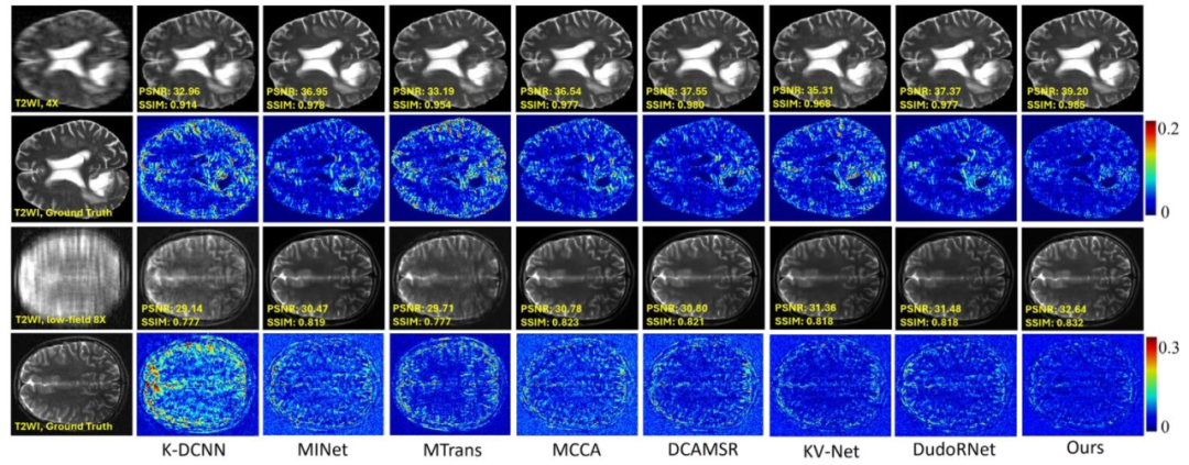 图4 本文方法与当前最先进方法的重建图像可视化对比。对比方法包括K-DCNN(Han等人,2019)、MINet(Feng等人,2021)、MTrans(Feng等人,2022)、MCCA(Li等人,2023)、DCAMSR(Huang等人,2023a)、KV-Net(Liu等人,2022)以及DuDoRNet(Zhou和Zhou,2020)。前两行展示BraTs数据集T2加权图像(T2WI)在4倍加速下的重建结果;后两行展示低场M4Raw数据集T2加权图像(T2WI)在8倍加速下的重建结果。