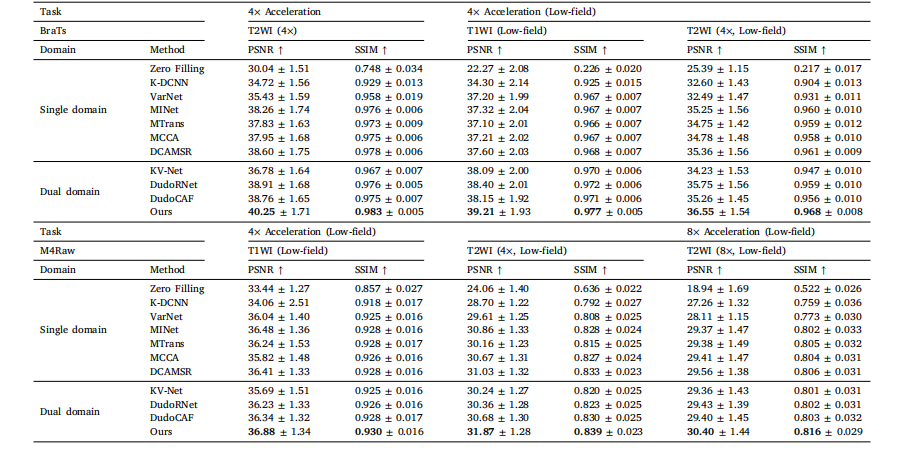 Table 1For the BraTs and M4Raw datasets, comparison of our method with state-of-the-art methods, including Zero Filling, K-DCNN (Han et al., 2019), VarNet (Sriramet al., 2020), MINet (Feng et al., 2021), MTrans (Feng et al., 2022), MCCA (Li et al., 2023), DCAMSR (Huang et al., 2023a), KV-Net (Liu et al., 2022), DudoRNet(Zhou and Zhou, 2020), and DudoCAF (Lyu et al., 2022). mean ± standard deviation are reported for each method, and the best metrics are highlighted in boldfont