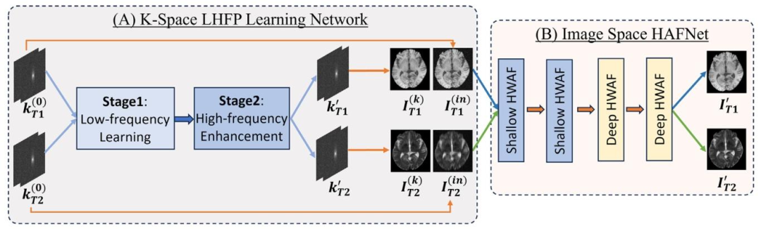 图1 本文提出的多对比度磁共振成像(MRI)重建框架示意图。低质量k空间数据k{T1}\^{(0)}和k{T2}\^{(0)}首先通过(A)k空间"低频到高频渐进式(LHFP)"学习网络进行优化,得到k{T1}'和k{T2}';优化后的k空间数据被转换为图像I_T(k_1)和I_T(k_2),同时原始k空间数据被转换为图像I_T(in_1)和I_T(in_2);这些多对比度图像I_T(k_1)、I_T(k_2)、I_T(in_1)和I_T(in_2)经(B)图像空间"混合注意力融合网络(HAFNet)"优化后,生成高质量图像I{T1}'和I{T2}'。
