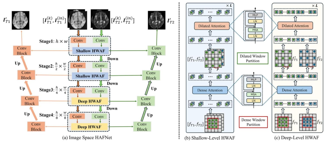 Fig. 3. Illustration of (a) the image-space HAFNet, which integrates multi-contrast features using (b) the Shallow-level HWAF in the first two stages and (c) theDeep-level HWAF modules in the last two stages, respectively