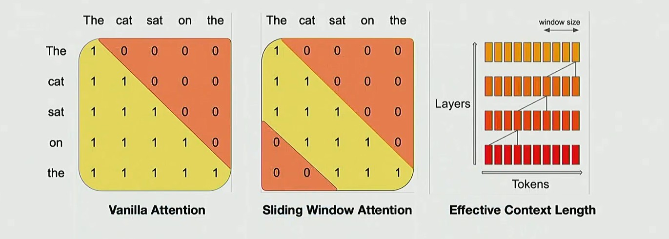 滑动窗口注意力机制(SWA):在每一层中,系统仅需处理当前位置附近的局部区域,这种方式还能控制整体所需的计算资源,从而可以处理更长上下文序列