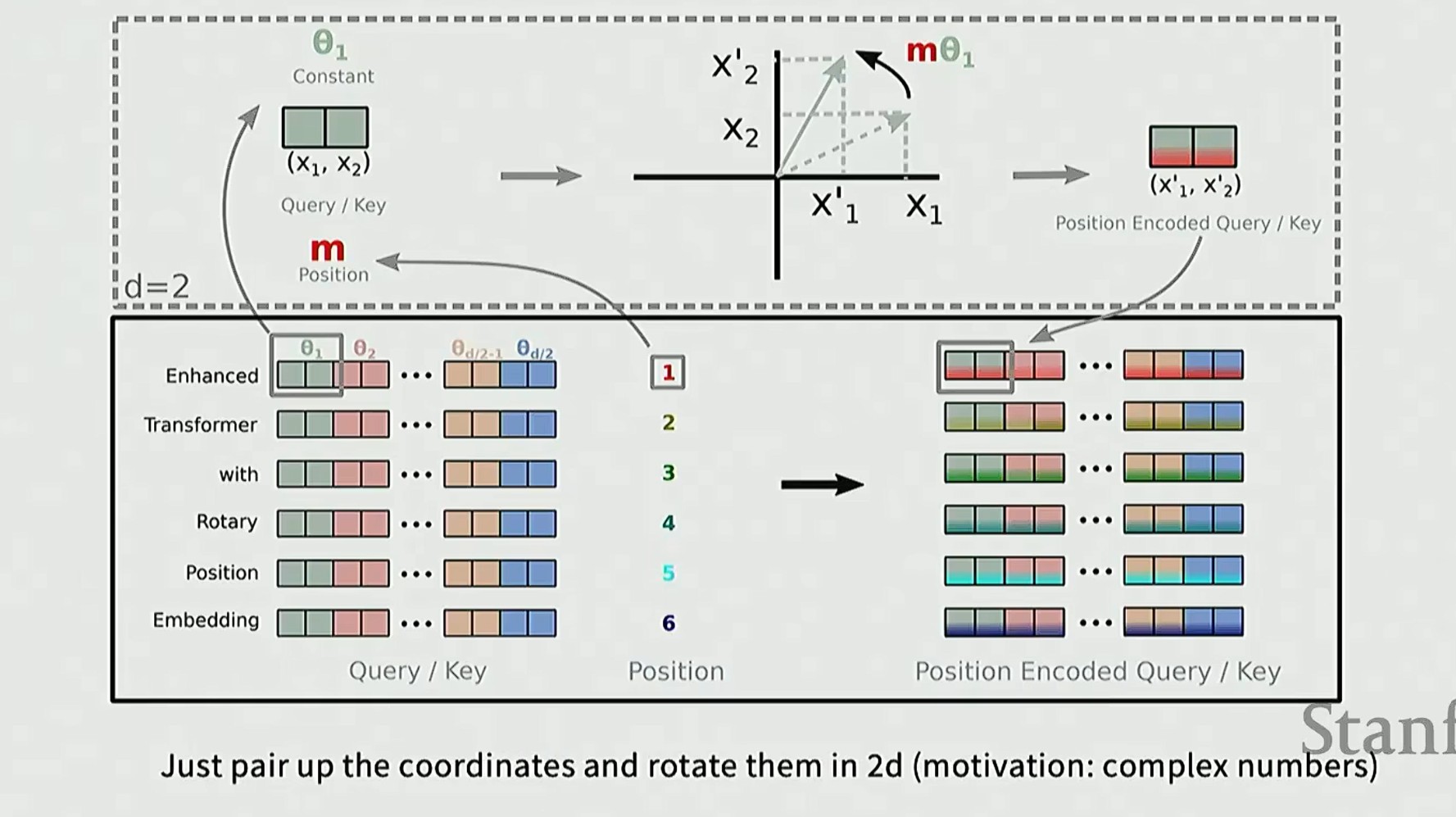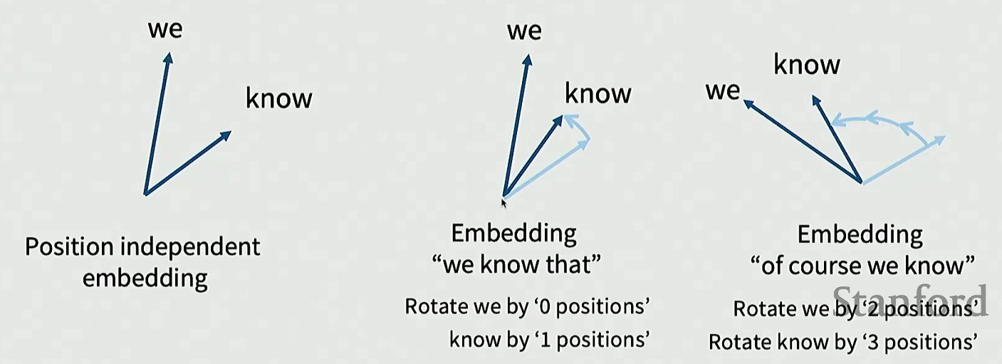 从最开始两个独立向量,到 'we know' 的嵌入表示(从左往右,0 开始计数),只有 know 需要旋转一次,到后面嵌入序列 'of course we know',两个向量的相对位置保持不变(夹角),一起旋转了两次