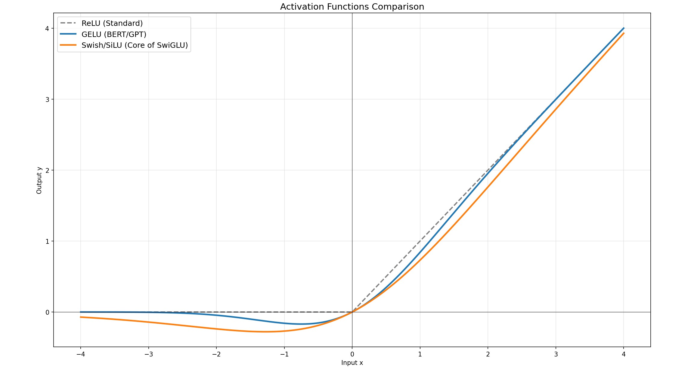 处理负值:GELU 在负值区域不是直接变 0,而是允许微小的负梯度流过(曲线在 0 附近会先稍微下沉一点点,再回到 0),这比 ReLU 保留了更多的信息