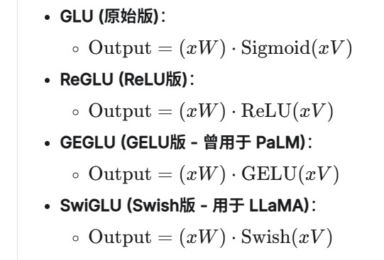 ReLU 和 GeLU 是纯粹的激活函数,而 GeGLU / SwiGLU 实际上是 GLU(门控线性单元的变体)