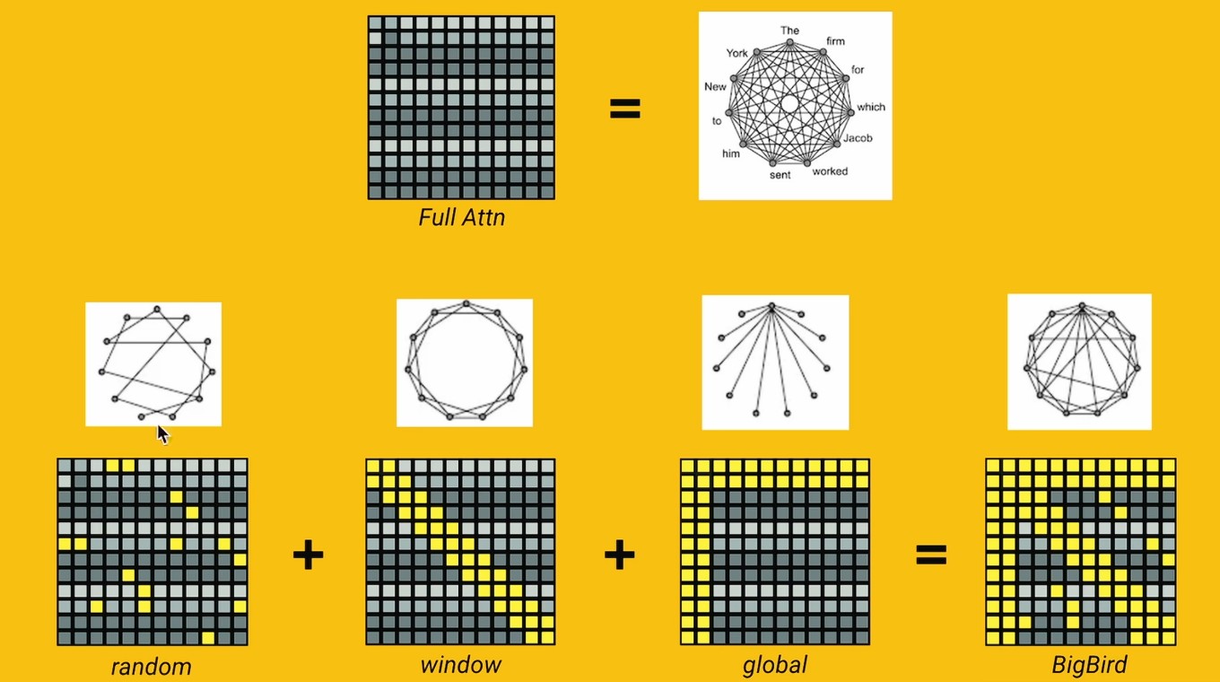 随机选取 + 窗口(和临近 token 计算)+ global(起始 token 和所有 token 计算)-> 稀疏注意力矩阵