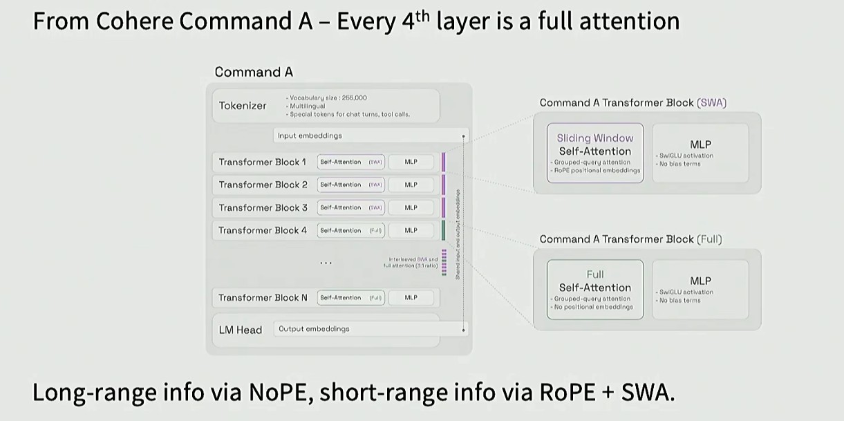 前三层使用 SWA,保证计算快、可以处理长文本,第四层使用 full attention,让模型捕捉全局信息关联