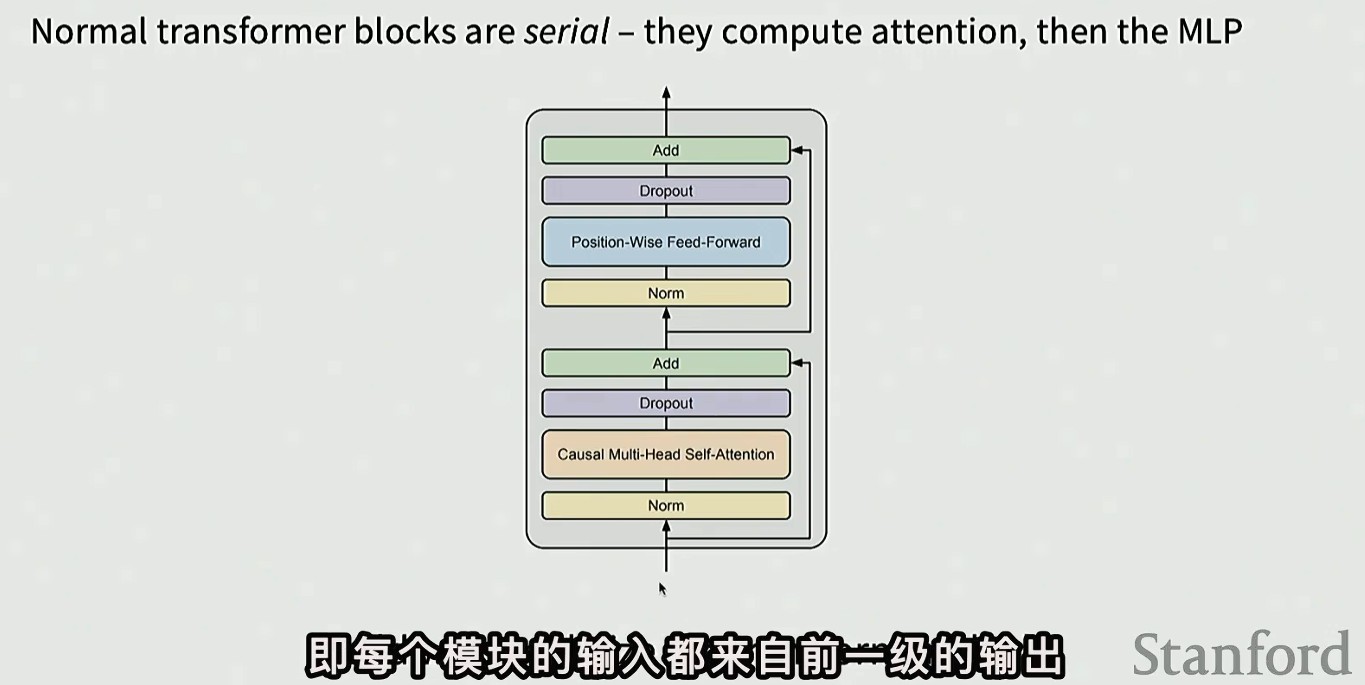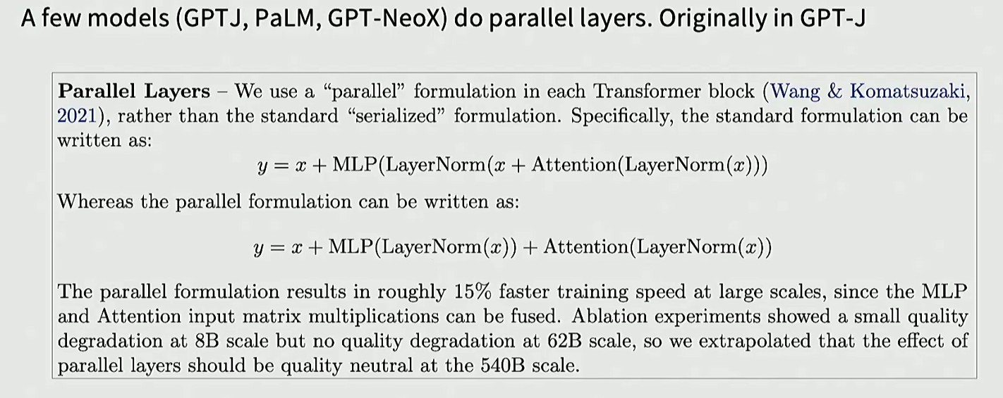 部分模型采用并行结构,并行计算 MLP 和自注意力,一同加到残差流中(更高效)