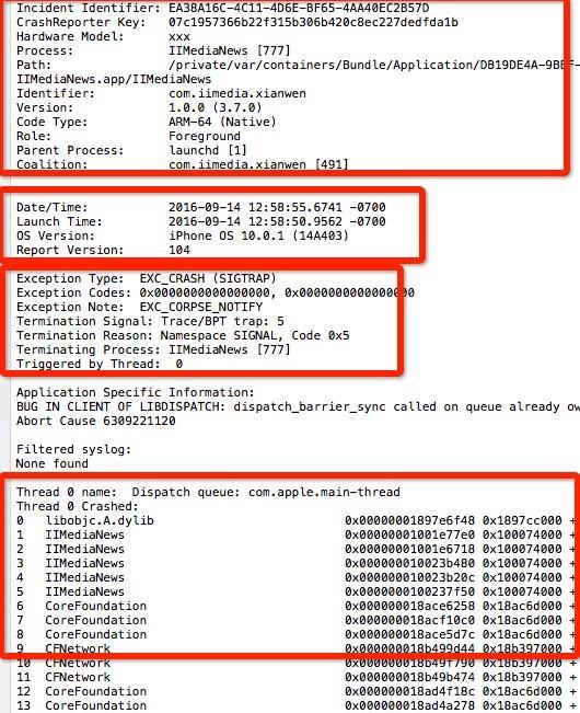 CrashReporter Key: 是与设备标识相对应的唯一键值。虽然它不是真正的设备标识符,但也是一个非常有用的情报:如果你看到100个崩溃日志的CrashReporter Key值都是相同的,或者只有少数几个不同的CrashReport值,说明这不是一个普遍的问题,只发生在一个或少数几个设备上。