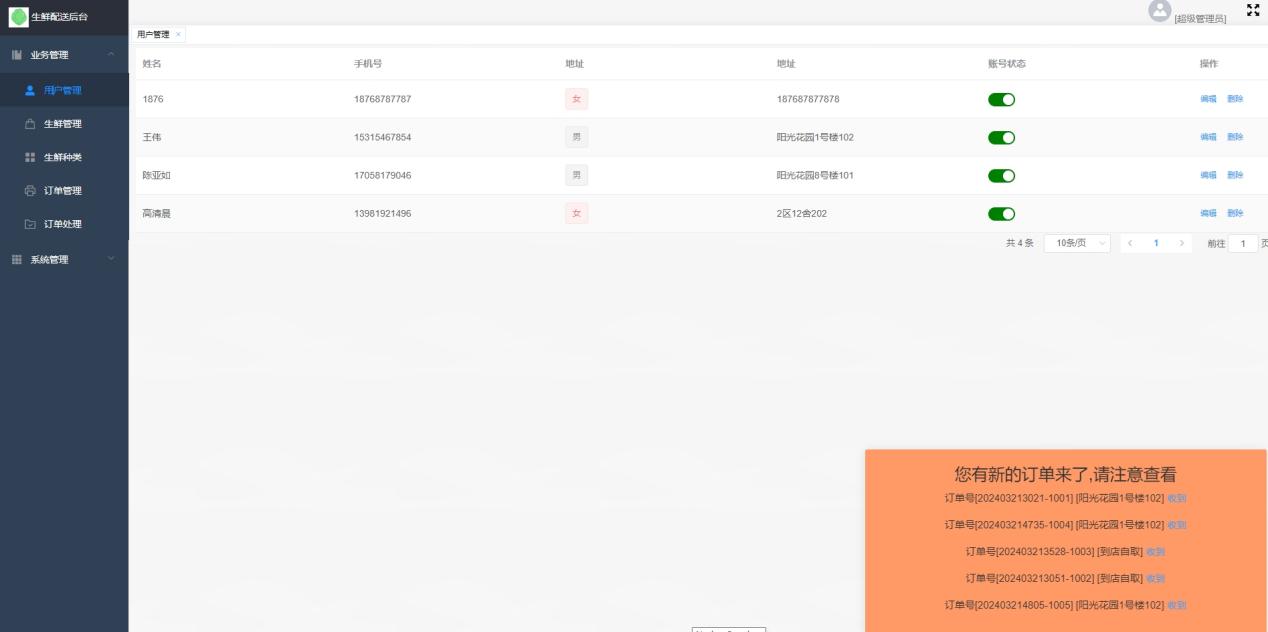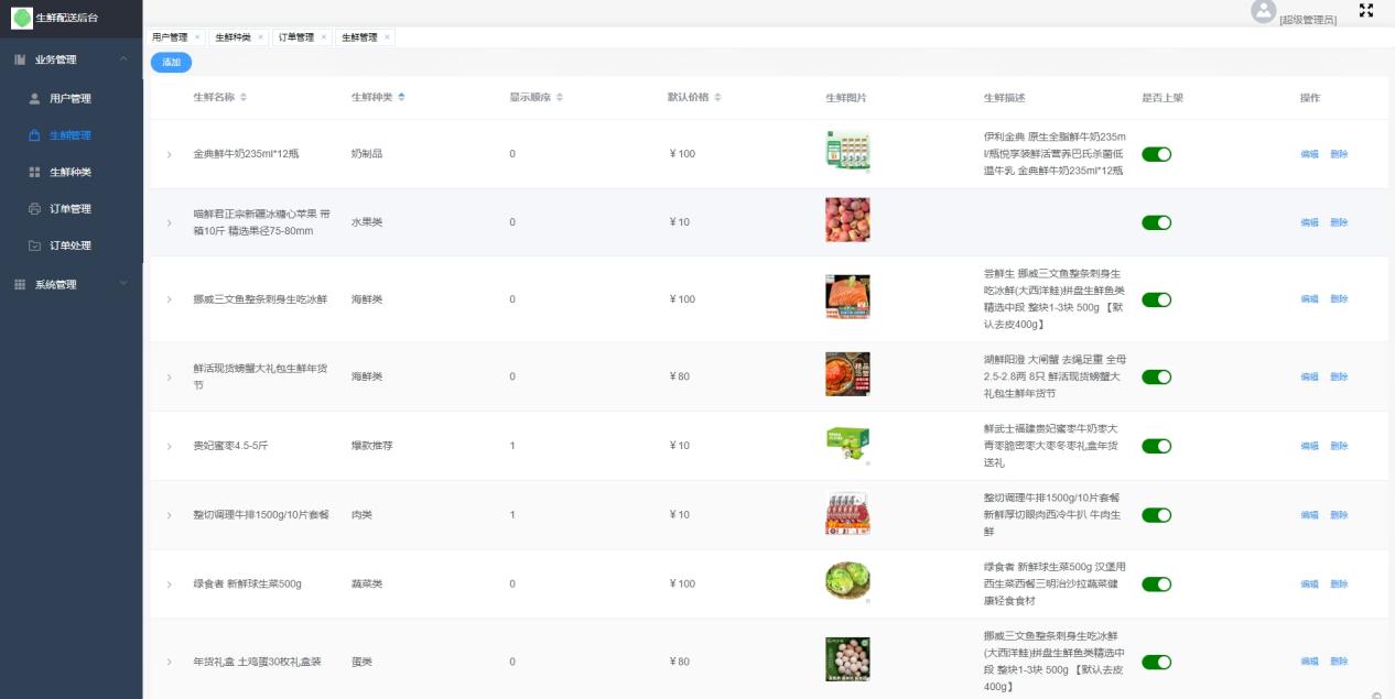 在此模块下管理员能对生鲜类别进行区分、上架新的生鲜、修改在售生鲜的详情、下架产品等一系列操作。