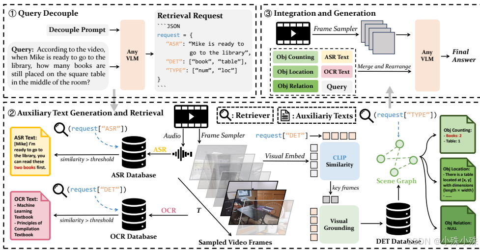 当用户提问后,模型先自动分析问题,判断需要从视频里找哪些类型的辅助信息。比如它会生成三类检索请求: