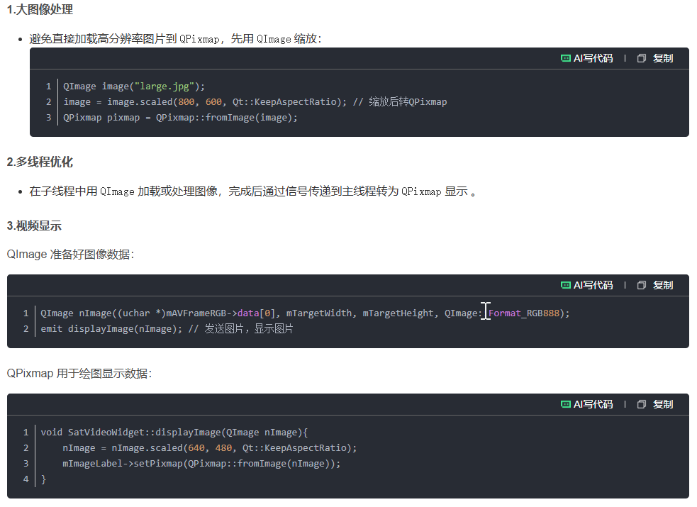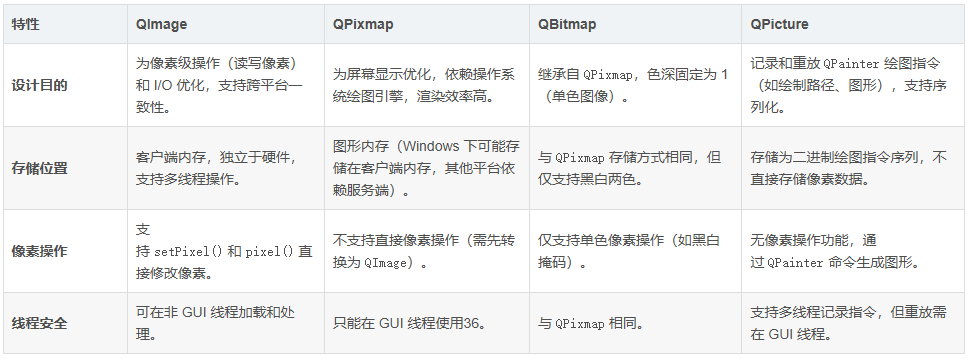 线程安全:QPixmap和QBitmap不适合在非GUI线程操作,而QImage是线程安全的。