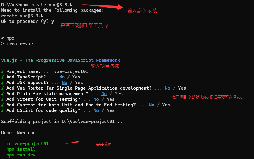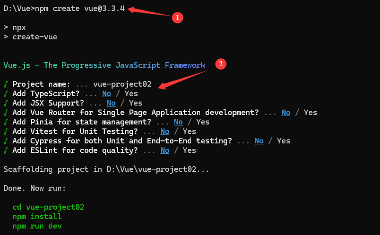 执行命令 npm create vue@3.3.4(@3.3.4为create-vue脚手架工具的版本,不指定则默认下载最新版本)