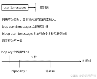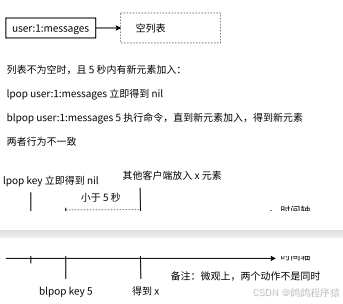 - 在列表中有元素的情况下,阻塞和⾮阻塞表现是⼀致的。但如果列表中没有元素,⾮阻塞版本会理解返回 nil,但阻塞版本会根据 timeout,阻塞⼀段时间(可以设置等待时间 ),期间 Redis 可以执⾏其他命令(阻塞期间不会对Redis使用产生影响),但要求执⾏该命令的客⼾端会表现为阻塞状态。