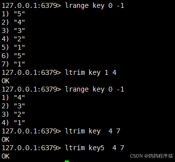 ltrim 保留区间 start 和 stop 区间(左闭右闭)的元素,其余元素全部删除。