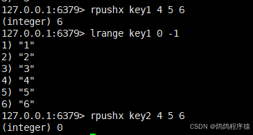 rpushx在 key 存在时,将⼀个或者多个元素从左侧放⼊(头插)到 List 中。不存在,直接返回