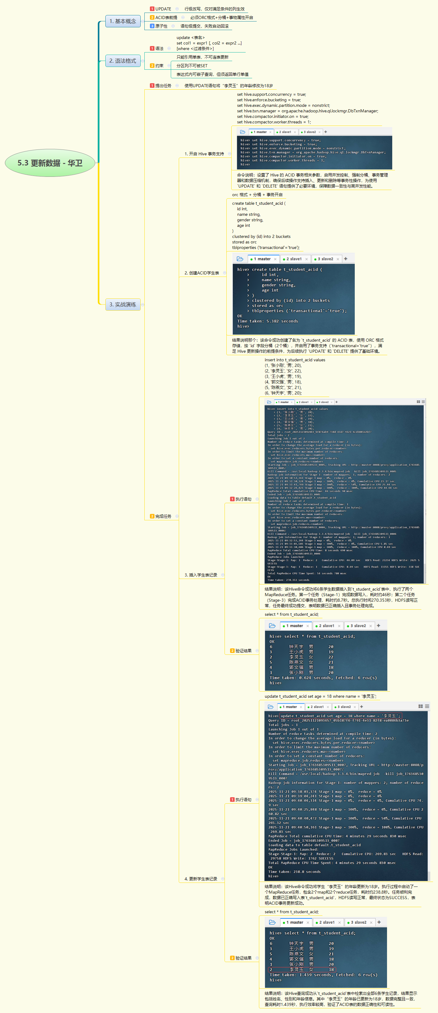 - 本实战演示了在Hive中基于ACID事务机制更新数据的完整流程:通过配置事务参数、创建ORC分桶ACID表、插入初始数据,并成功使用UPDATE语句将"李灵玉"的年龄修改为18岁,验证了Hive对行级更新的支持及数据一致性保障。