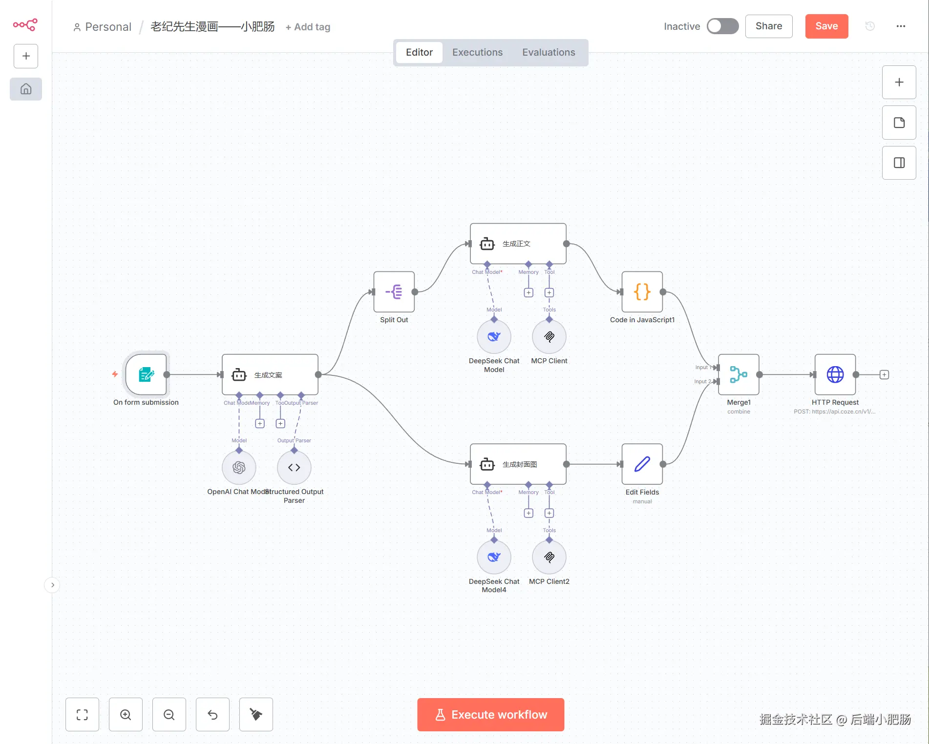 前两天基于Coze和n8n实现的养生漫画Coze+n8n实战:我把养生美食漫画做成了自动化流水线,你只需提交个标题!得到了很多人的一致好评。这两样群友纷纷问能不能实现老纪先生漫画那种风格,我的回答当然是可以的。我用半天时间搭建了这个工作流: