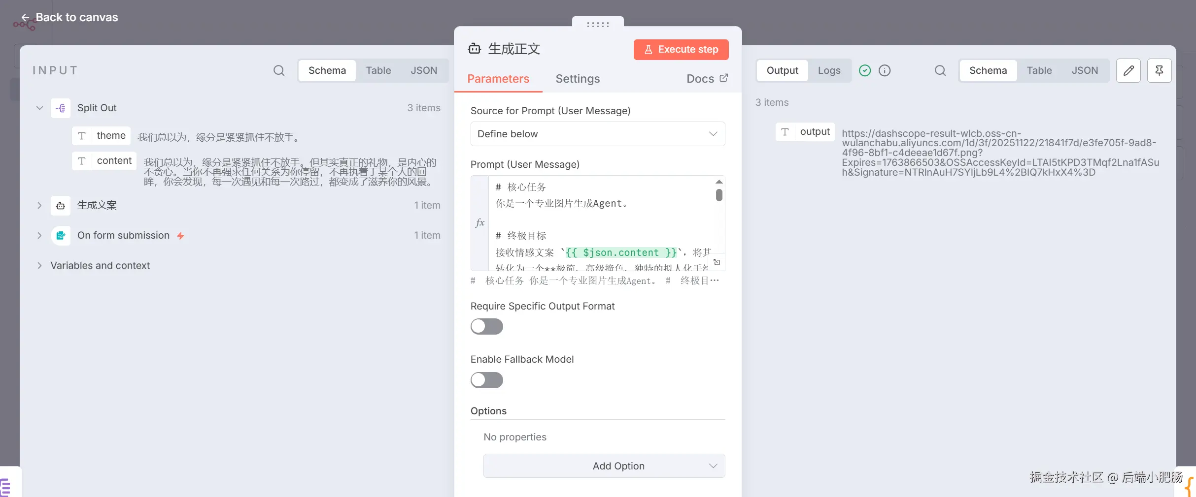 生成正文(AI Agent):Split Out 节点出来后点击【+】新增AI Agent节点,这个节点的作用是基于前置节点传入的文案生成图片,其配置方法与3.1小节封面图生成一样,不再赘述。