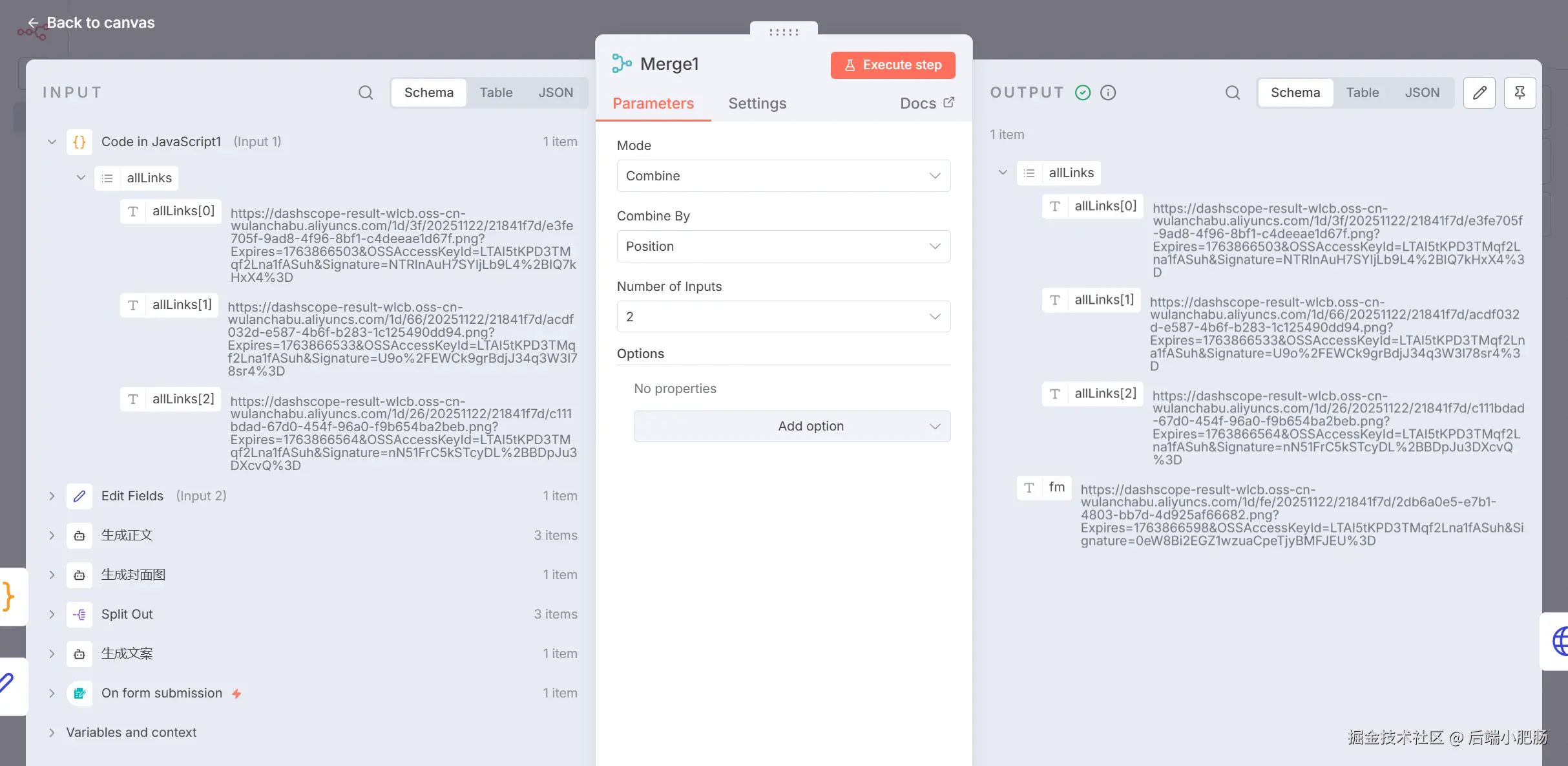Merge:Code in JavaScript 和Edit Fields 节点出来后点击新增Merge节点,集成前置节点生成的封面图和正文漫画等元素。