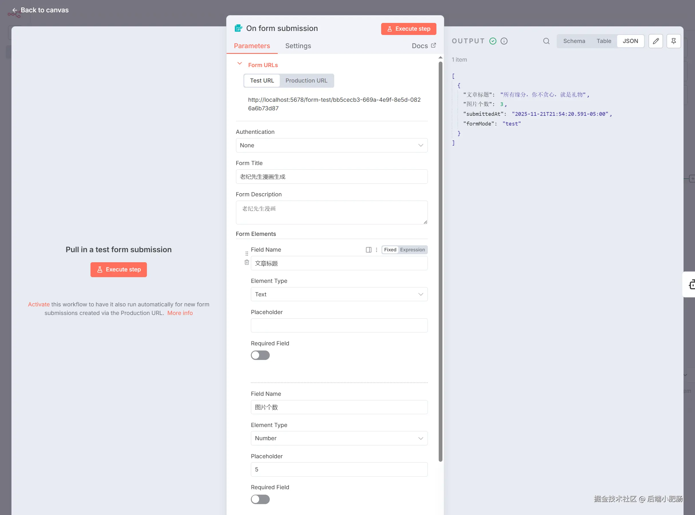 工作流的使用方法很简单,只需要点击底部的【Excute workflow】按钮,在弹出的表单中填写文章标题 和需要生成的图片个数。